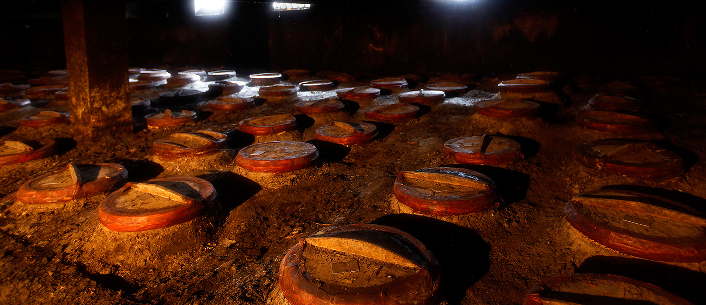 地下酒窖總占地面積3322平方米,總建筑面積5658平方米,窖內共有陶壇3800余只,儲酒陶壇壇齡在百年以上,被譽為“中國白酒的地下宮殿”。儲存的原酒在獨特的培土窖藏環境中,歷經歲月沉淀,酒體自然老熟,成為滴滴珍貴的稀世陳釀,被稱為“液體黃金”。