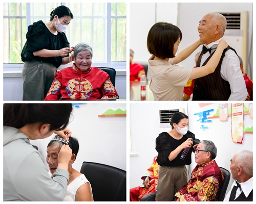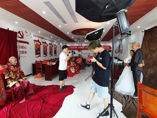 活動前夕,公司組織攝影團隊提前為張渡村里近百對金婚老人拍攝了婚紗照。第一次穿上“嫁衣”對鏡梳妝,老人們面露羞澀,可臉上洋溢幸福在這些夫婦中,婚齡最大的86歲老人尤其寅和84歲老人張翠連已經相伴走過64年。